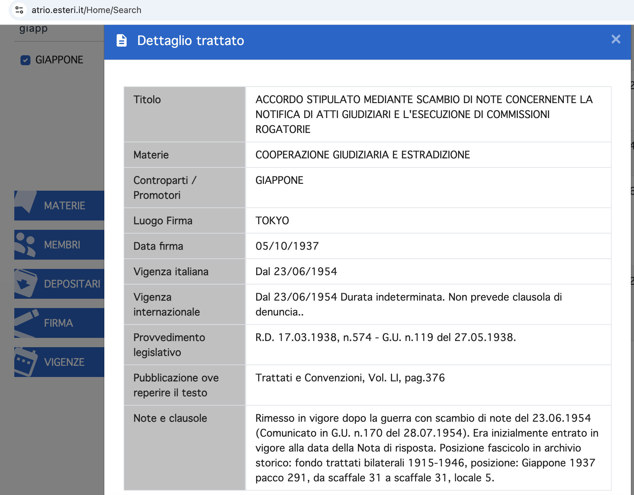 Accordo stipulato mediante scambio di note concernente la notifica degli atti giudiziari e l’esecuzione di commissioni rogatorie tra l’Italia e il Giappone, firmato a Tokio il 5 ottobre 1937 [scheda Archivio dei Trattati]